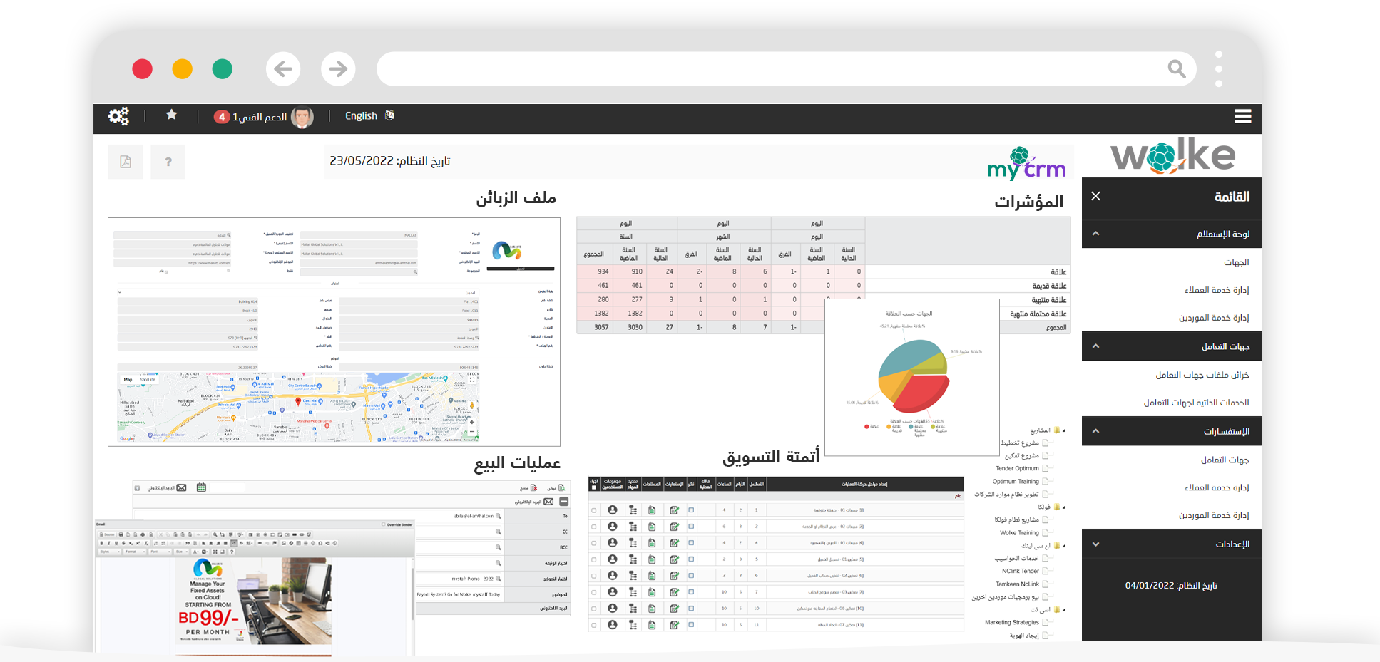 نظام خدمات العملاء تعمل على أتمتة خدمات العملاء بأكملها والأنشطة ذات الصلة كما يمكن تحديد مناطق خدمة العملاء مسبقًا في النظام ويمكن توفير وصول محدود أو كامل للعملاء بناءً على نوع العميل أو الخدمات المستخدمة. تتوفر أيضًا بوابة دعم للعملاء شاملة وسهلة الاستخدام كجزء من النظام.