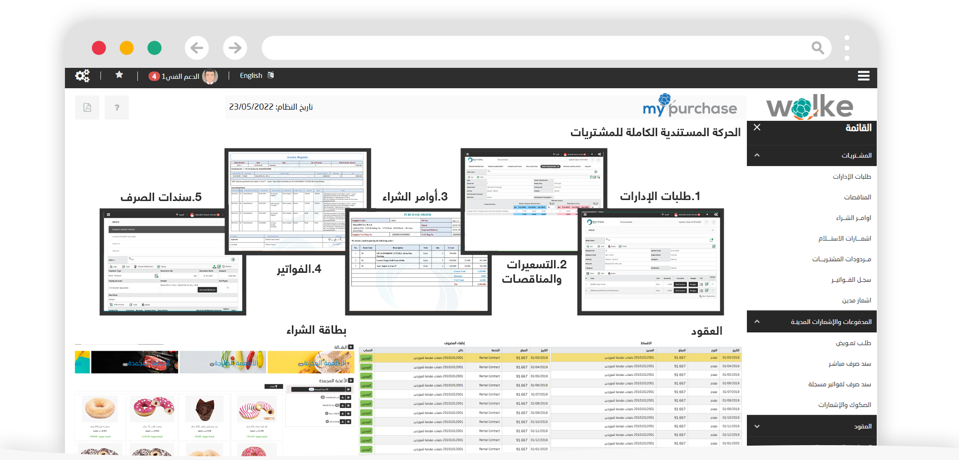 تشمل mypurchase الدورة المستندية للمشتريات والمصروفات بالكامل إبتداء من طلبات شراء وعمل طلبات التسعيرات وأوامر الشراء والتسليم والفواتير إنتهاءاً بالمدفوعات. تم دمج Optimum بالكامل مع أنظمة المخزون والأصول الثابتة.